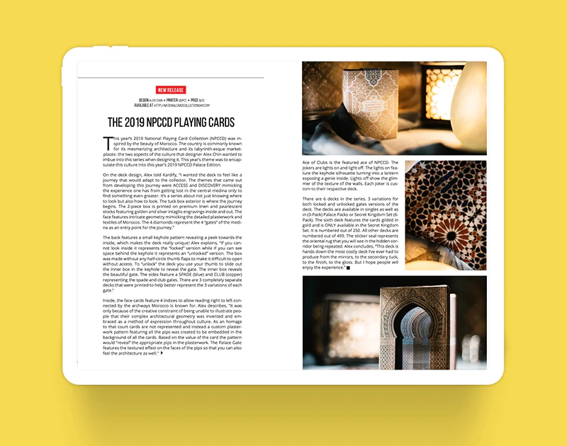 + NPCCD 2019: This yearβs 2019 National Playing Card Collection (NPCCD) was inspired by the beauty of Morocco. Find out more behind Alex Chin's inspiration.